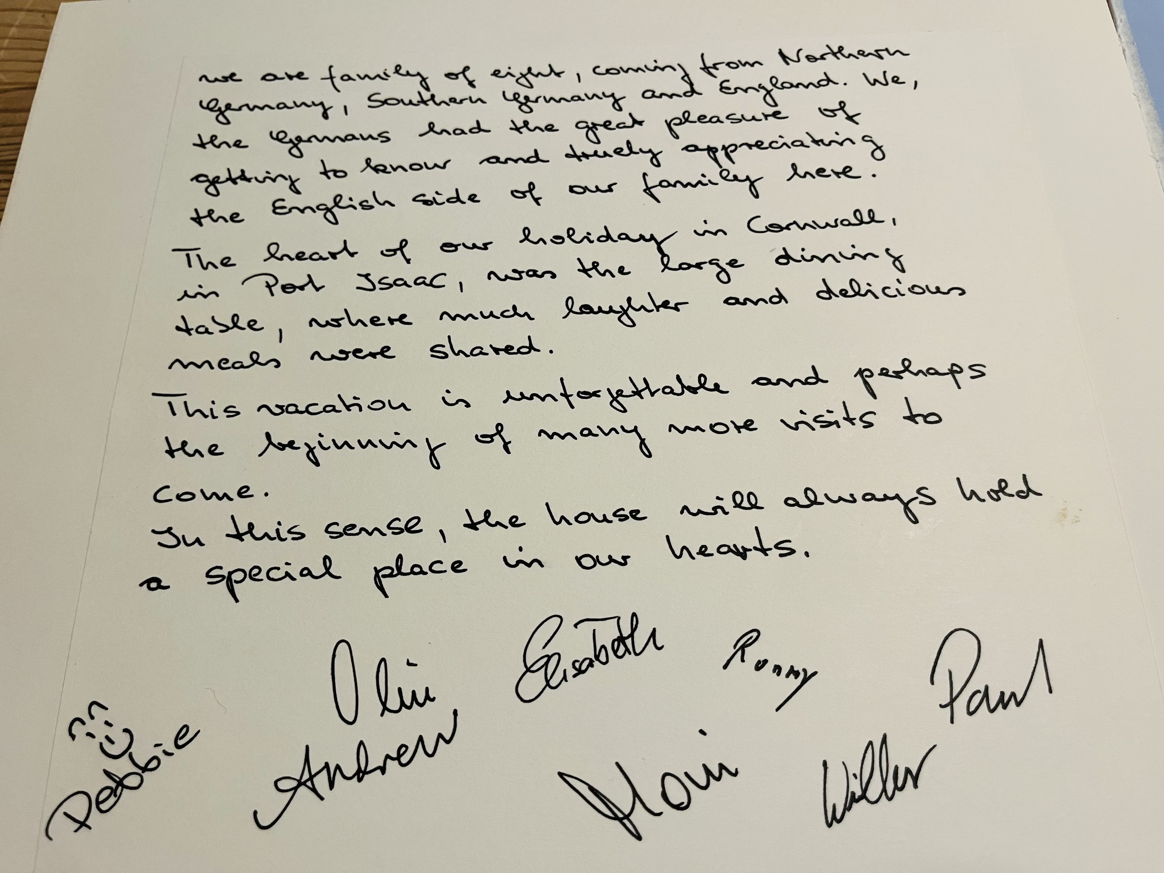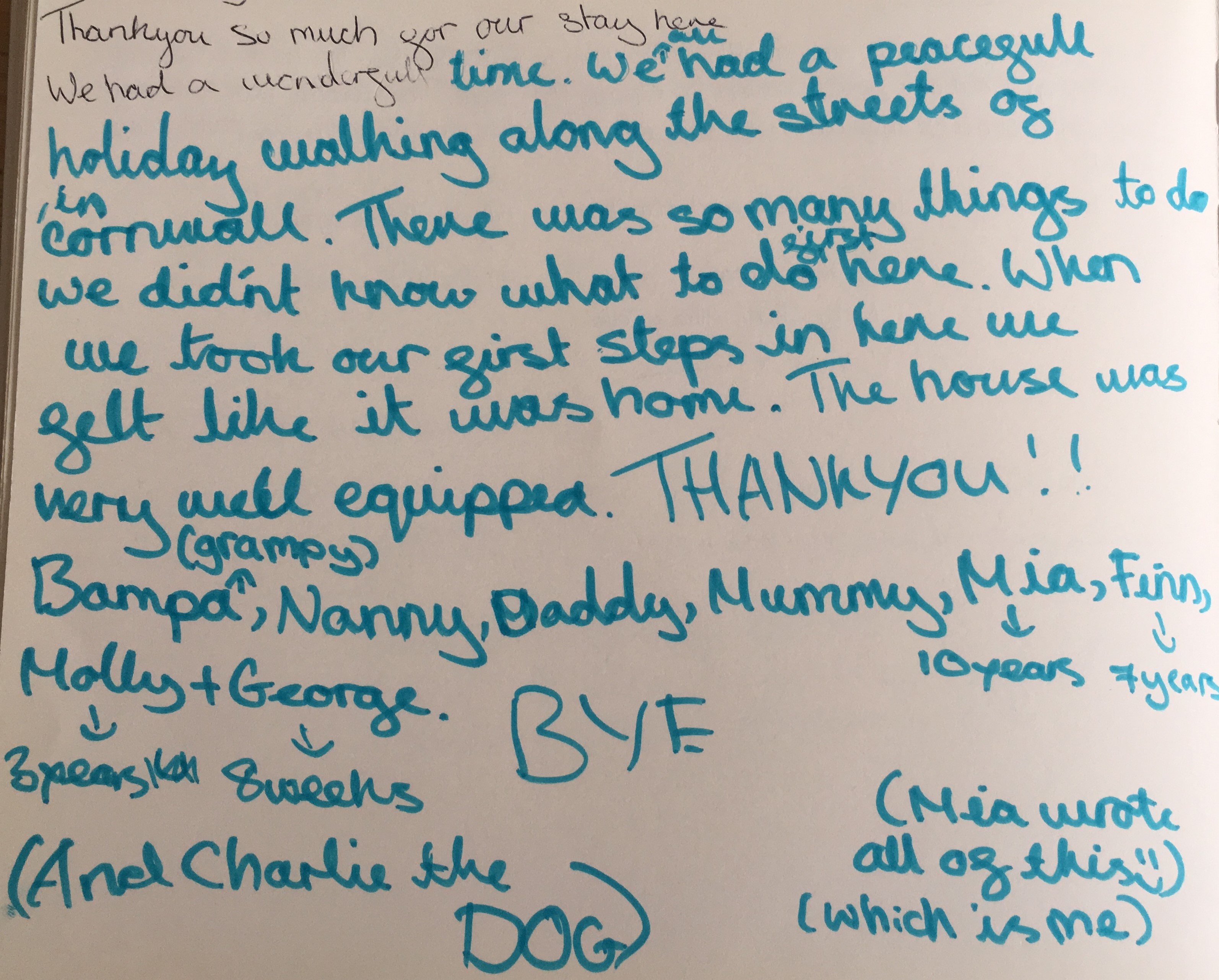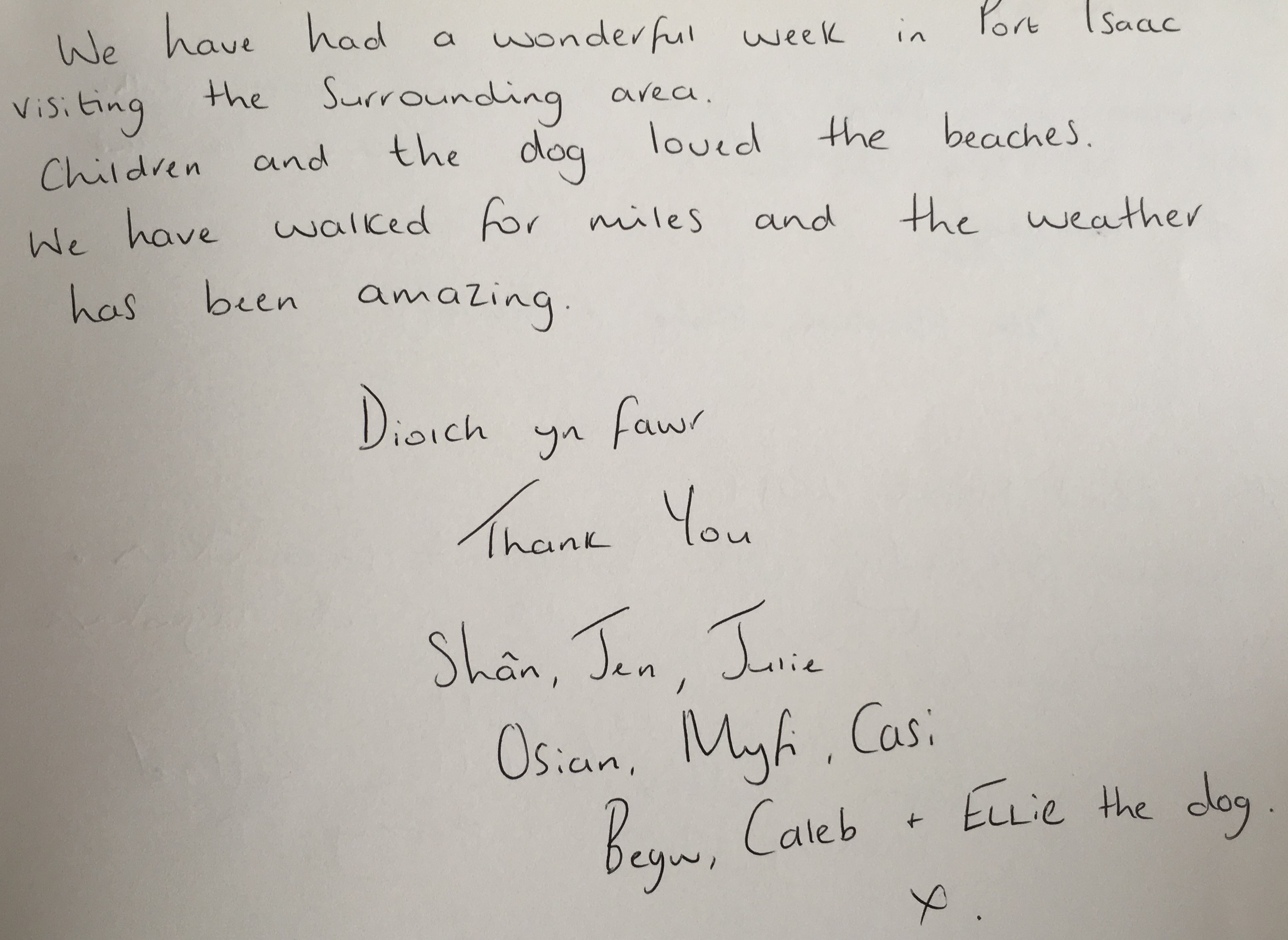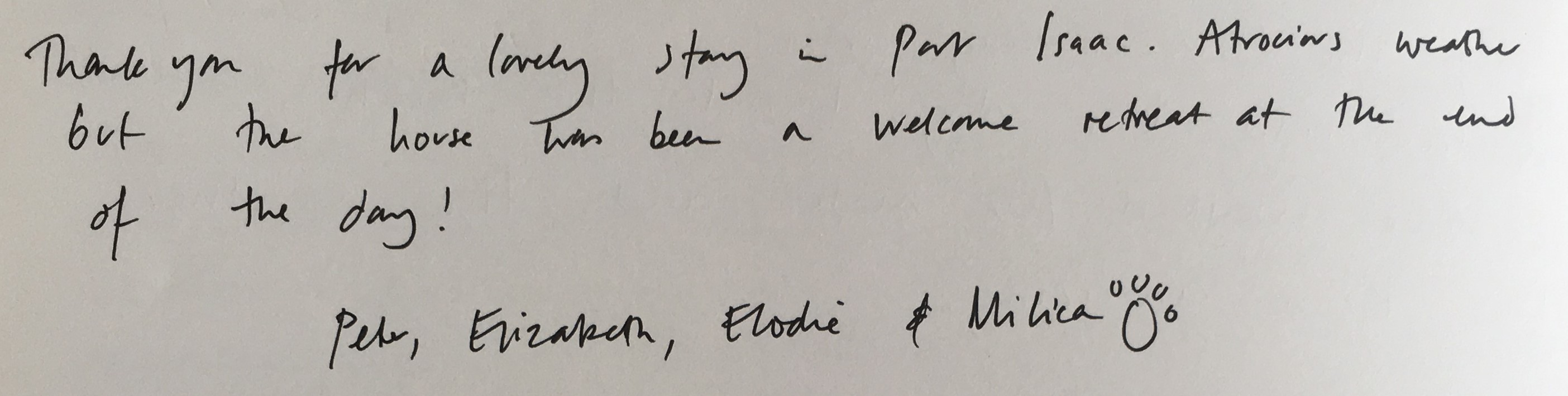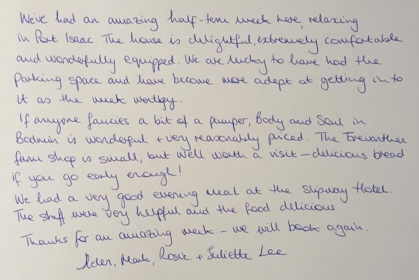 "Thank you. We have had a wonderful time in your beautiful house. It is superbly equipped. We have stayed in many house throughout Cornwall and this is by far the best equipped"