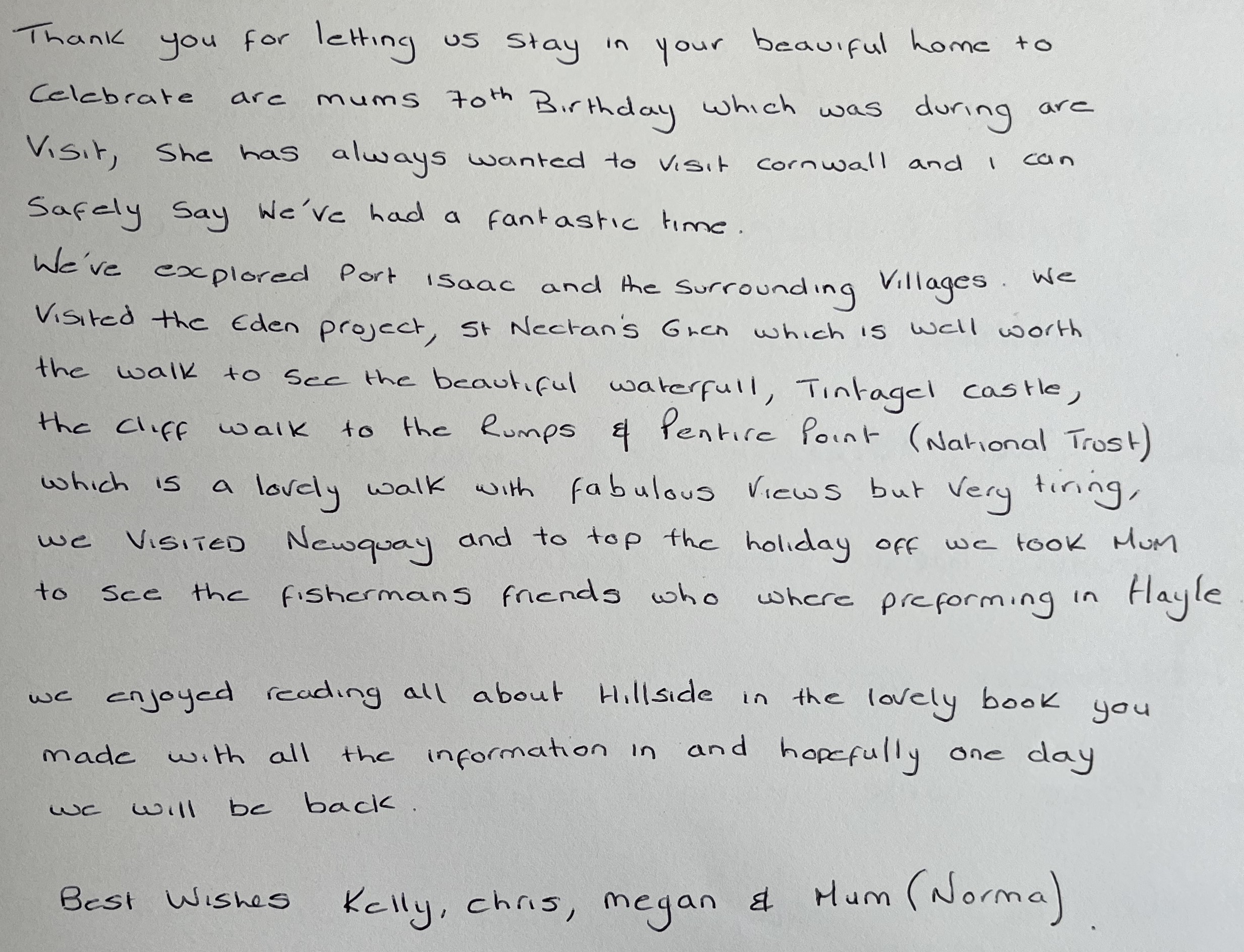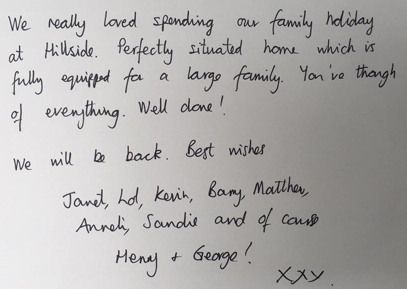 "Our 4th stay at Hillside but our 1st Christmas here. It has been absolutely wonderful and we've all made special memories together, including a very impromptu performance from "Fisherman's Friends" on Christmas Eve. We're all very sad to leave but hope to return again soon"