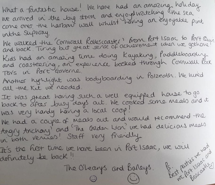 "I have had a wonderful week staying here with my children, grandchildren and dogs. We have enjoyed the comfort of the house and all the amenities, well equipped kitchen, excellent spacious bathrooms and comfortable beds! The beaches have been super for surfing and pottering in rock pools. Lots of jellyfish! Our last night we had a delicious meal at The Mote and an impromptu performance by the 'Fisherman's Friends'... Perfect!"